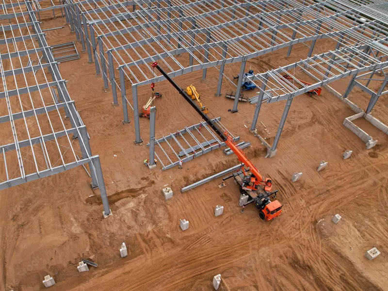 ส่วนประกอบของเหล็กรวมถึงคานเสาวงเล็บปีกกาและโครงหลังคาหลังคาจะถูกทำไว้ล่วงหน้าในโรงงาน ใช้เหล็กคุณภาพสูงและส่วนประกอบจะถูกผลิตขึ้นตามข้อกำหนดที่แม่นยำเพื่อให้แน่ใจว่ามันเข้ากันได้อย่างแม่นยำและปลอดภัยในระหว่างการติดตั้ง สภาพแวดล้อมที่ควบคุมนี้ช่วยให้สามารถวัดการควบคุมคุณภาพที่เข้มงวดได้มั่นใจถึงความทนทานและความน่าเชื่อถือของส่วนประกอบ