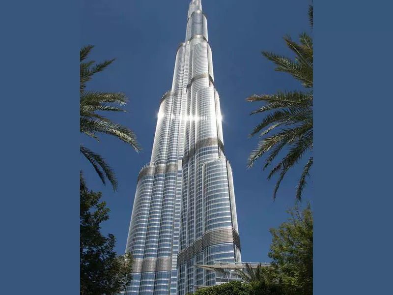 ● Burj Khalifa ในดูไบ, ยูเออีเป็นอาคารที่สูงที่สุดในโลกด้วยกรอบลูกผสมคอนกรีตคอนกรีต มันอยู่ที่ 163 ชั้นและสูงกว่า 828 เมตร